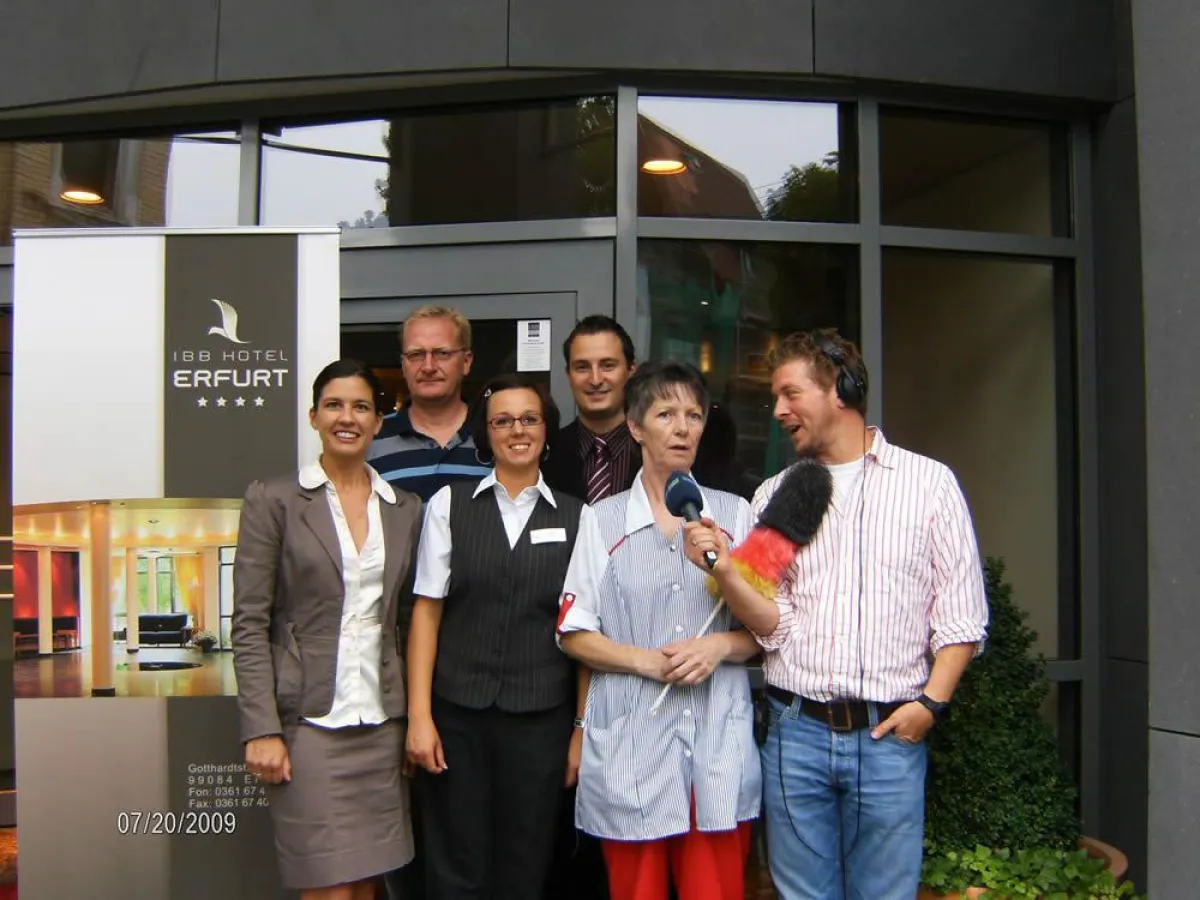 Bildunterschrift: Moderator Marco Ramm (rechts im Bild mit Mikrofon) berichtete live von seiner Arbeit als „Urlaubsvertretung“ im IBB Hotel Erfurt auf MDR 1 RADIO THÜRINGEN. Die Mitarbeiter freuten sich über die tatkräftige Unterstützung: (von rechts) Karin Willnauer (stv. Hausdame), Katja Weidner (Service), (hinten von rechts) Toni Becker (Sales Manager), Gunther Burchard (Haustechnik). Links Bianca Müller, Director PR der betreuenden PR-Agentur hotelbiz consulting.