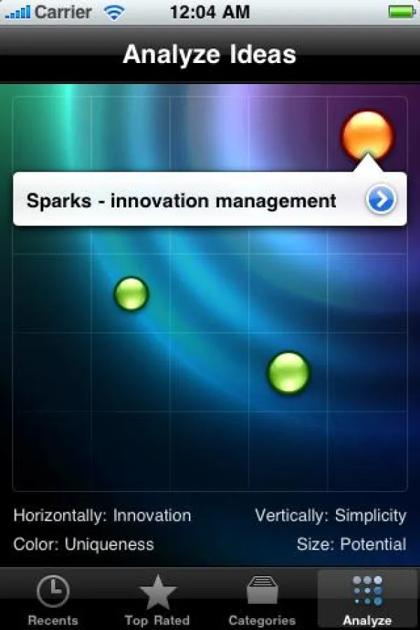 Sparks erlaubt Benutzern ihre Ideen in den Dimensionen Innovation, Einfachheit, Einzigartigkeit und Potential zu bewerten. Diese Kreativitätsdimensionen werden dann mithilfe eines farbigen Charts visualisiert, was das Durchforsten und Analysieren von Ideen einfach macht. Sparks hilft sprichwörtlich dabei die "Spreu von Weizen" zu trennen. Weiters haben Benutzer auch schnellen Zugriff auf die zuletzt erfassten Ideen sowie auf die jeweils besten Ideen über tabellarische Listen.