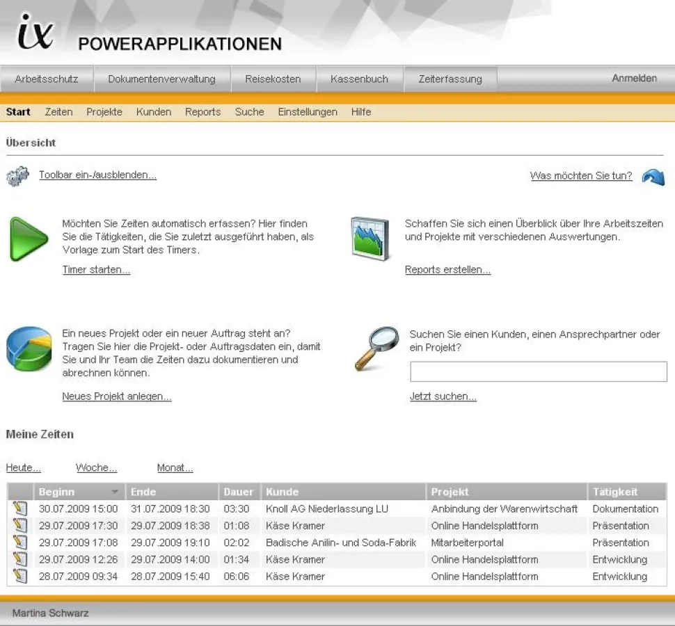 Sofort nach der Installation der Intrexx Zeiterfassung können Kunden und Projekte angelegt werden, denen die Zeiten später direkt zugeordnet werden. Dank der leicht verständlichen Menüführung ist die Anwendung vollkommen selbsterklärend, wodurch sich zeitraubende Schulungen erübrigen. Auch die Zeiterfassung selbst erfolgt auf denkbar einfache Weise - per Stoppuhr oder durch manuelle Eingabe der Arbeitszeiten. Sollte man einmal vergessen haben, die Zeiten zu erfassen, ist es ebenfalls unkompliziert möglich, diese zu einem späteren Zeitpunkt nachzutragen.