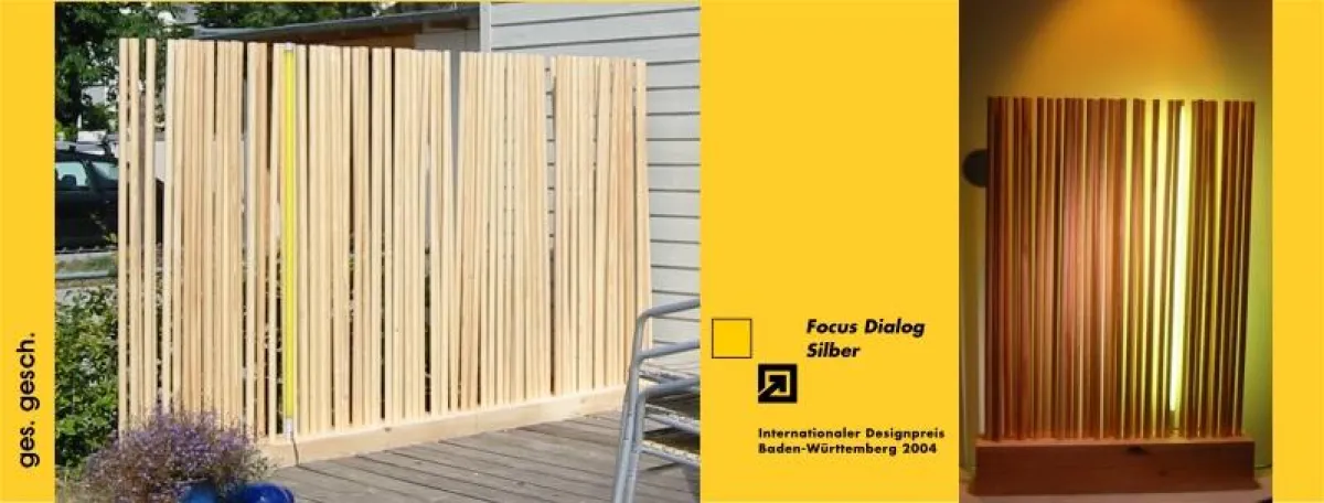 (openPR) Der ursprünglich für Außenräume entwickelte Lichtparavent vereint die Funktionen Sichtschutz und Beleuchtung. Das Element gliedert Raumbereiche und erzielt abhängig vom Lichteinfall strukturierte, belebte Schattenräume. Die spielerische Reihung der Stäbe aus Eschen- oder Lärchenholz vermeidet den Eindruck einer abgeschotteten Fläche. Ein spezieller optischer Effekt ermöglicht dies. Im Vorbeigehen scheinen die Stäbe als geschlossene Fläche, befindet man sich auf einem Sitzplatz ermöglicht die Anordnung aber Blickdurchlässigkeit. Gemäss der Entwurfsidee natürliche Elemente zu strukturieren, symbolisieren die Stäbe in ihrer Anmutung Schilfgräser.
