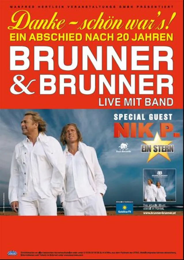 Vom 15. Oktober bis zum 19. Dezember dieses Jahres präsentieren Brunner & Brunner jetzt nicht nur ihre größten und neuesten Hits, sondern haben ihren langjährigen Musikerfreund Nik P. „Ein Stern der deinen Namen trägt" als ihren „Special Guest" zu den Konzerten in Deutschland eingeladen. In Österreich ist es Andreas Gabalier, der als Gaststar dabei sein wird.
