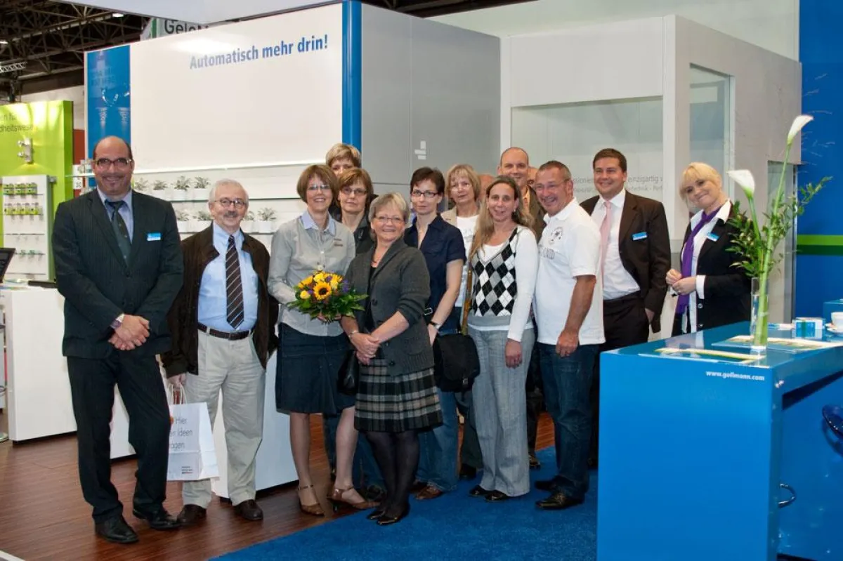 Halle (Saale)/Düsseldorf. Das Team der Rubens-Apotheke war am Sonntag, dem 27. September, nahezu komplett auf dem Expopharm-Stand der Gollmann Kommissioniersysteme GmbH vertreten, als Apothekerin Meike Brockhaus-Kehl den Vertrag für ihren neuen Kommissionierautomaten, den insgesamt 100. Automaten der Firma Gollmann, unterzeichnete.