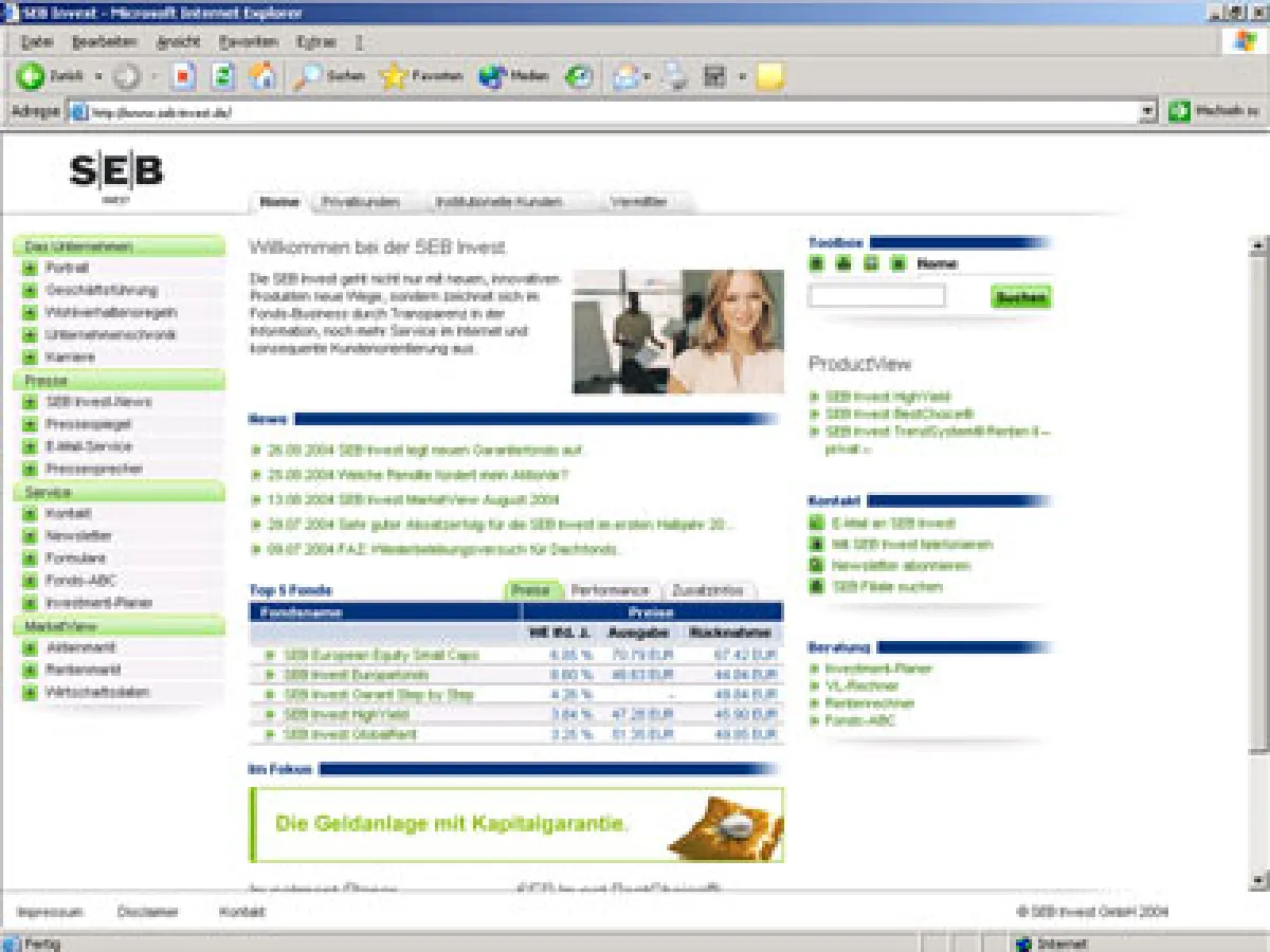 Die Website bietet den Nutzern neben ausführlichen Informationen zu den Fonds-Produkten auch weitere tiefgehende Informationen zum Fonds-Business und schafft somit eine hohe Transparenz in der komplizierten Thematik. Zusätzlich wird durch weitreichende Service-Angebote die konsequente Kundenorientierung der SEB Invest unterstrichen. Als ganz besonderen Service bietet die SEB-Invest einen Investment-Planer an, mit dessen Hilfe sich die Kunden ein psychografisches Profil erstellen lassen können, aus dem dann eine personalisierte Anlagestrategie präsentiert wird.