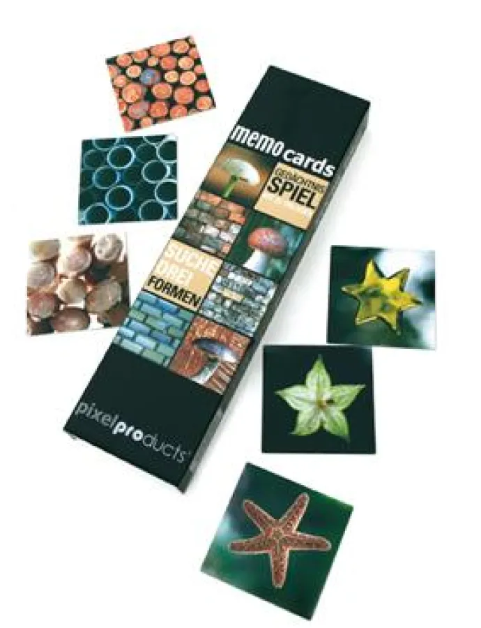 Schon mal eine Spirelli-Nudel aus der Nähe angeguckt? Johanna Liebsch, die Künstlerin hinter pixelproducts, hat es getan und entdeckt, dass die nicht nur richtig hübsch ist, sondern formell betrachtet auch noch aussieht wie ein Bohrkopf – oder wie Kringelband. Diese und andere ungewöhnliche Trilogien sind Thema des neuen Memocards Gedächtnisspiels „Suche Drei Formen“. Dabei lernt der Spieler, ganz genau hinzuschauen und Alltagsdinge mal durch die künstlerische Brille zu betrachten. Und auf einmal ist die Welt voller Rechtecke, Spiralen, Kreuze und Hexagone.