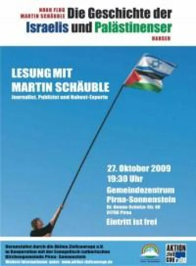 .Am Dienstag 27.Oktober 2009, um 19:30 Uhr, lädt die Aktion Zivilcourage e.V. in Kooperation mit der Evangelisch-Lutherische Kirchengemeinde Pirna-Sonnenstein zu einer öffentlichen Veranstaltung, im Gemeindezentrum Pirna Sonnenstein (Benno Scholze Straße 40, 01796 Pirna), ein. Dort wird der Journalist und Politikwissenschaftler Martin Schäuble über das Thema Israel und Palästina referieren. Um eine kurze Voranmeldung über Ihr Kommen wir gebeten.