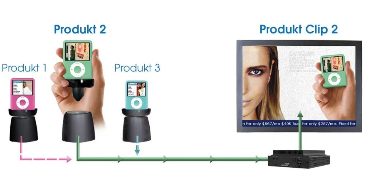 1. Einem kleinen, lüfterlosen und wartungsfreien miniPC, welcher über mehrere Auslöse-Schalter mit Ausstellungs-Produkten verbunden ist. Es sind bis zu 32 Produkte pro miniPC möglich. Sobald der Kauf-Interessent ein Produkt aufnimmt, wird dadurch ein Signal gegeben und der entsprechende Werbeclip auf dem darüber angebrachten LCD-Screen abgespielt. Alternativ kann die Auslösung auch über RFID oder einen Bewegungssensor geschehen.