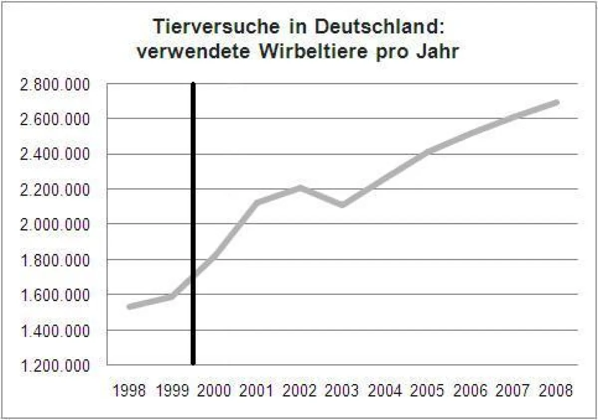 Anmerkung zur Grafik: Im Jahr 2000 wurde das Verfahren zur Erhebung der Tierversuchszahlen verändert. Daher sind die Daten von vor 2000 nur begrenzt mit denen seit 2000 vergleichbar.