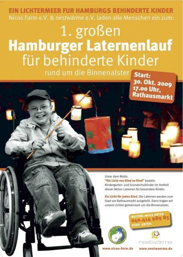 Hamburg, 30. Oktober 2009 - Am Freitag wird in Hamburg der Abendhimmel von unzähligen tanzenden Lichtern erleuchtet werden. Die Vereine nestwärme und Nico’s Farm laden alle Hamburger Familien zum großen Laternenlauf rund um die Binnenalster ein und möchten mit einem Lichtermeer ein fröhlich leuchtendes Zeichen für Hamburgs behinderte Kinder setzen.