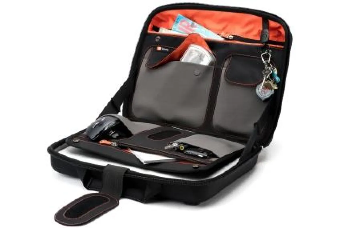 Typisch booq: Im Inneren finden sich zahlreiche offene, mit Magnetknopf oder Reißverschluss versehene Fächer für Zubehör & Co. Ob Power Adapter, Maus, Telefon, iPod oder Visitenkarten, das tägliche Business-Allerlei kann problemlos ordentlich verstaut werden.