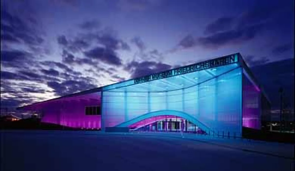 Das Gebäude in Form eines Hangars lässt über große Fensterflächen großzügig Tageslicht herein, das nur bei Bedarf durch Kunstlicht ergänzt wird. Bei Dunkelheit wird das Gebäude selbst zu einem aus sich heraus strahlenden Leuchtpunkt in der Nacht ergänzt durch eine Lichtkunstinszenierung von James Turrell.