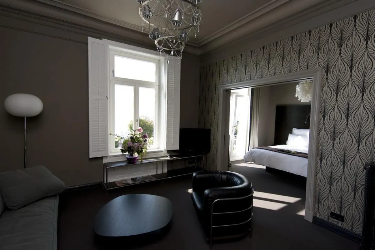 Auf Zimmer Nr. 5 erwarten den Gast zur Begrüßung handgefertigte Pralinen. Bett, Tisch, Stuhl, Flatscreen – alles ist neu, modern. Gerade Linien und klare Formen bestimmen das anspruchsvolle Design. Das Licht des Kronleuchters ist angenehm dezent, das dunkle Holz des Betts wirkt behaglich. An den Wänden hängt moderne Kunst. Einen gelungenen Kontrast zu den Brauntönen des Raumes bildet die Tapete: Sie ist pink! Neben der Tür fällt ein wunderschöner alter gusseiserner Heizkörper ins Auge. Es sind solche Einzelheiten, die den besonderen Reiz des Hotels ausmachen.