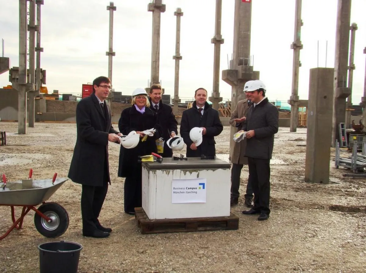 Der 4. Bauabschnitt auf dem 20-Hektar-Areal zwischen der Münchener „AllianzArena“ und dem Garchinger Forschungsgelände (TUM) an der A 9 wurde jetzt im Beisein geladener Gäste in Angriff genommen. Dass die langfristige Standortstrategie über alle Konjunkturphasen hinweg trägt, bekräftigte dabei Christian Bretthauer, Sprecher der Zentralgeschäftsführung der Unternehmensgruppe Dr. Vielberth (Hauptsitz Regensburg). Sie steht hinter dem privaten Investment. Die auf Gewerbeparks, Shopping Center und andere anspruchsvolle Immobilien spezialisierten Entwickler sind seit mehr als 40 Jahren erfolgreich am Markt vertreten und verwalten nahezu alle realisierten Objekte im Eigenbestand. Seit 2005 wächst das Expansionsprojekt heran, mit dem Garching an Profil gewinnt.