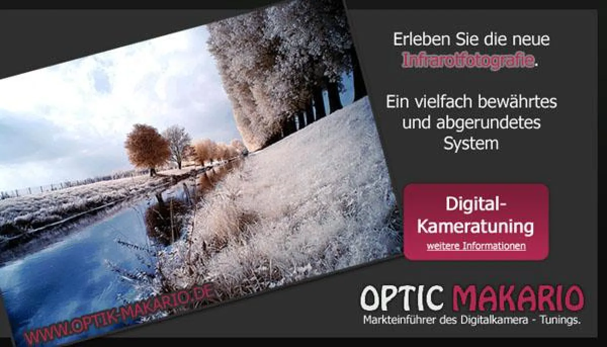 Infrarotfotografie bildet Objekte im für das menschliche Auge nicht sichtbaren Infrarotspektrum ab, was zu völlig anderen Ergebnissen führt als die Fotografie im sichtbaren Licht. Dies war in der Vergangenheit umständlich und benötigte teureres und schweres Equipment. Durch ein innovatives Verfahren zur Modifizierung von digitalen Spiegelreflexkameras wurde es möglich Ergebnisse mit sehr kurzen Verschlusszeiten und höher aufgelösten und schärferen Bilder als bisher zu erzielen. Das ist insbesondere für Spezialanwendungen interessant wie z.B. für den privaten, gewerblichen, technischen und wissenschaftlichen Einsatz: Baugewerbe, Objekt,- und Personen - Überwachung, Materialprüfung, Naturwissenschaften, Medizin und Journalisten bzw. Presse, um nur einige zu nennen. Auch im privaten Bereich gibt es immer mehr Hobby-Fotografen, die die Infrarotfotografie für sich entdeckt haben und damit erstaunlich kreative Fotografien erstellen. Die Optic Makario GmbH – http://www.optik-makario.de - aus Mönchengladbach hat die Markteinführung des Digitalkamera-Tunings initiiert und ist auf den Umbau von digitalen Spiegelreflexkameras spezialisiert, die zu Sonderanwendungen gedacht sind. Außer der Infrarotfotografie bietet das Unternehmen auch die Modifizierung von handelsüblichen D-SLR-Kameras für die Astro- und die Ultraviolettfotografie an. Philosophie des Kameraumbaus ist, die Kamera in den undefinierten Zustand zu bringen, also die volle Empfindlichkeit des Bildwandlers zu nutzen, um dem Fotografen die Definition selbst zu überlassen. Das eröffnet einzigartige und ungeahnte Möglichkeiten.