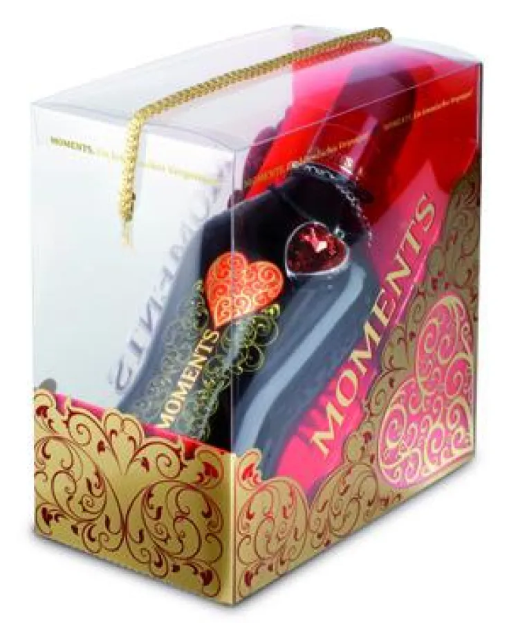 Das aufwändige Design setzt durch die auffällige Herz-Optik ein Zeichen der Liebe und der Freundschaft. Der Mehrfarb-Golddruck sowie die exklusive Goldfolienprägung geben der Flasche einen besonders edlen Hauch. Zusätzlich verleiht die Klarsicht-Geschenkpackung mit Goldverzierung und schimmernder Tragekordel Moments einen bezaubernden Geschenk-Charakter und macht den Kirschlikör zu einem hochwertigen Premium-Präsent. Neben dem exklusiven Design von Flasche und Verpackung ist ein edles Herz-Kollier in drei individuellen Farben Rot, Gold und Diamant ein ganz besonderes Highlight zum Valentinstag.