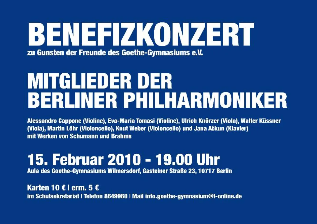 (openPR) In der Aula des Goethe-Gymnasiums in Berlin-Wilmersdorf findet am 15. Februar 2010 um 19 Uhr ein Benefizkonzert von Mitgliedern der Berliner Philharmoniker zu Gunsetn der Freunde des Goethe-Gymnasiums e.V. statt.