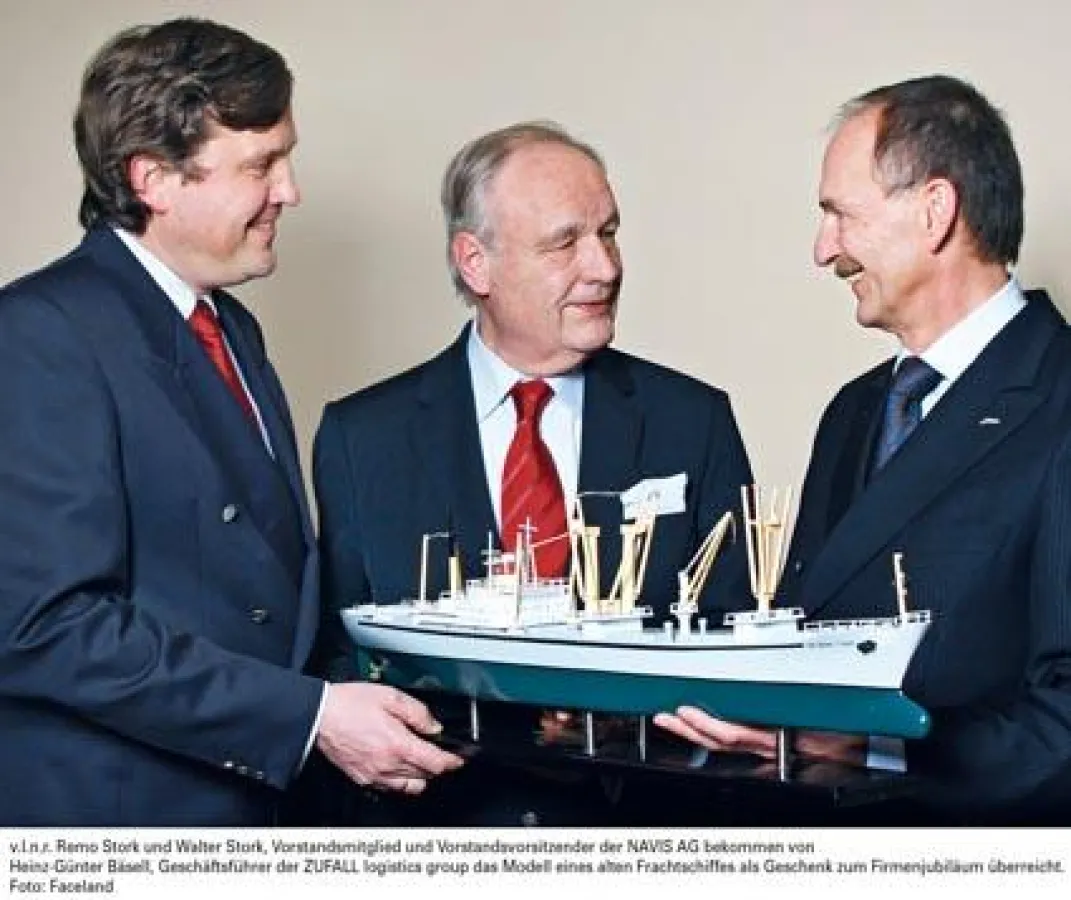 Walter und Remo Stork – Vorstandsvorsitzender und Vorstandsmitglied der NAVIS AG – stand die Freude über das originelle Erinnerungsstück, das den Namen "MS Müller-Stork" trägt, ins Gesicht geschrieben. "Für uns ist die Zusammenarbeit mit ZUFALL immer etwas ganz besonderes gewesen", bilanziert der 75-jährige Walter Stork die Kooperation mit dem mittelständischen Transport- und Logistikdienstleister, der seinen Hauptsitz in Göttingen hat. Der Grundstein für die Arbeitsgemeinschaft, die bis Ende 2009 rund eine Million Sendungen befördert hat, wurde im Spätsommer 1969 gelegt. Ein gemeinsamer Kunde hatte damals die Unternehmen aus Hamburg und Göttingen an einen Tisch – und miteinander ins Gespräch – gebracht. Walter Stork: "Wir haben uns damals mit den ZUFALL-Verantwortlichen Dr. Gerhard Müller und Richard Israel in einem Hotel getroffen und die Eckdaten einer möglichen Zusammenarbeit besprochen – und sehr schnell viele Gemeinsamkeiten festgestellt." Dabei erinnerten die räumlichen Gegebenheiten eher an einen Politthriller, als an ein Treffen künftiger Geschäftsfreunde. "An einem sehr, sehr langen Tisch saßen wir auf der einen und die Leute von ZUFALL auf der anderen Seite. In der Mitte nahm unser gemeinsamer Kunde Platz, der auch die Moderation übernahm", fasst Senior Stork die Szenerie anno 1969 zusammen.