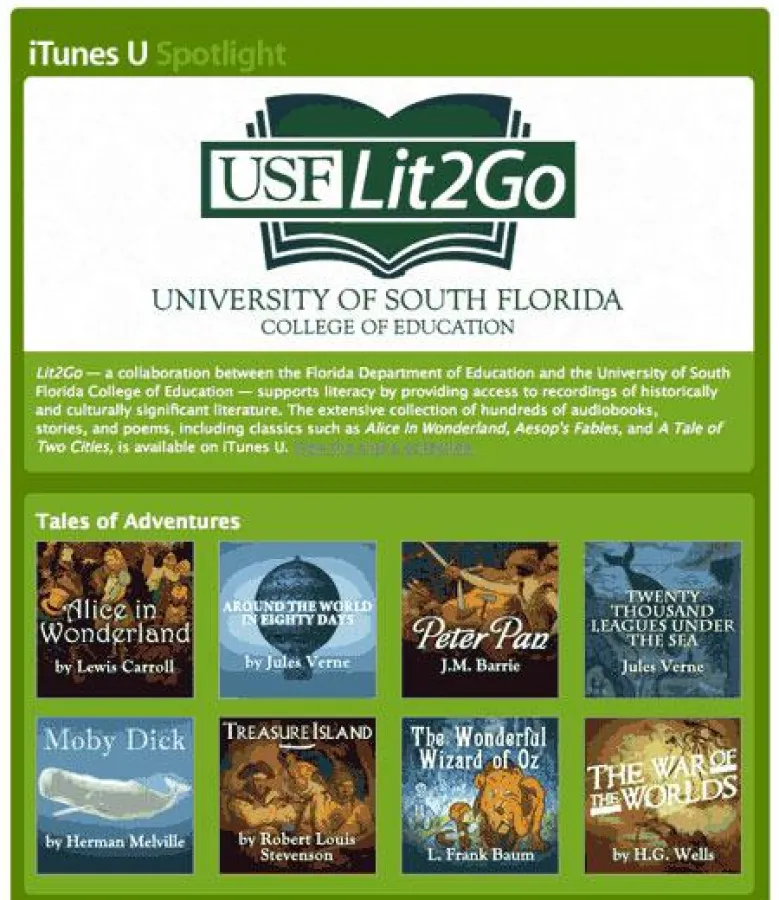 Lit2Go — a collaboration between the Florida Department of Education and the University of South Florida College of Education — supports literacy by providing access to recordings of historically and culturally significant literature. The extensive collection of hundreds of audiobooks, stories, and poems, including classics such as Alice In Wonderland, Aesop’s Fables, and A Tale of Two Cities, is available on iTunes U. View the entire collection.