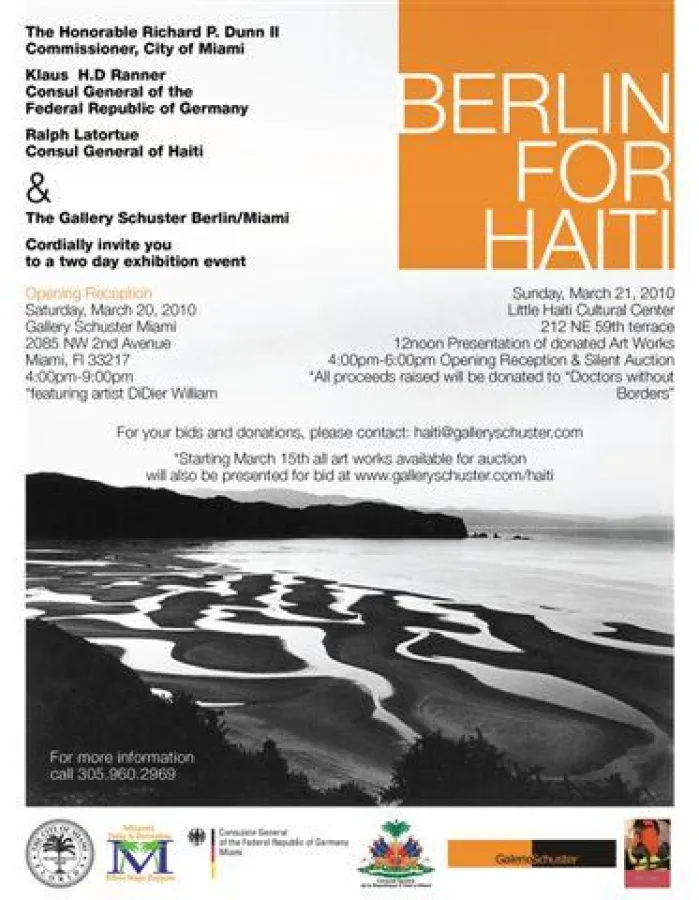 Die Galerie Schuster organisiert gemeinsam mit ihren Partnern eine Auktion hochkarätiger internationaler Kunst am Sonntag, den 21. März. Die Arbeiten werden sowohl im Internet als auch im Original im Haitianischen Kulturzentrum in Miami zu sehen sein. Die Kunstwerke werden über das Berliner Netzwerk der Galerie Schuster eingesammelt und gespendet. Angesprochen sind alle Galerien in Berlin, alle der Galerie bekannten Künstler, die Leiter der deutschen Kunstvereine und die Leiter der zeitgenössischen Museen in Berlin und Deutschland und die der Galerie bekannten Sammler. Die Aktion wird direkt, im Internet und über Facebook beworben um einen möglichst weitreichenden Schneeballeffekt zu erzielen.