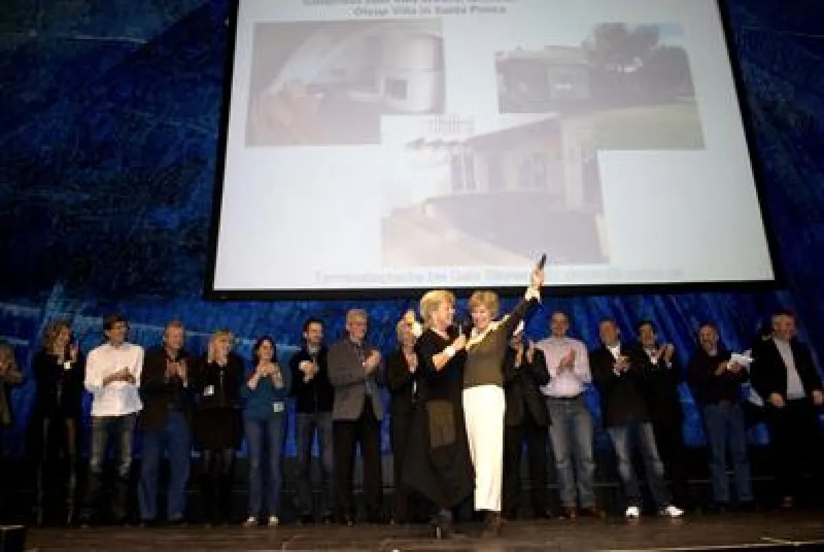 Und immer noch sollten drei weitere „magische Momente“ folgen. Den ersten stellte die Gesangseinlage von Anja dar, die mit Worten nur so unzureichend beschrieben werden kann, dass wir hier ausnahmsweise einen Link veröffentlichen: http://tinyurl.com/ydr2nub. Der zweite dieser Momente entstand, als alle Versammelten gemeinsam mit Anja die „Ode an die Freude“ von Ludwig van Beethoven sangen. Und der dritten und ultimative „magischen Moment“ bestand in der Verlosung von 3 Mallorca-Reisen in die Gäste-Villa von Gabi Steiner, die jeweils von ganz besonderen Menschen aus ihrem Team gewonnen wurden: Der erste Gewinner war ein ganz neuer Partner, der erst wenige Wochen dabei ist. Der zweite Gewinner hatte sein Network-Geschäft im Alter von 69 Jahren begonnen und kam jetzt, mit 72, gesund und rüstig auf die Bühne. Und der dritte Gewinner schließlich war eine Frau, die erst kürzlich eine Operation am Bein über sich hatte ergehen lassen müssen und die unter dem Applaus der Zuschauer von Dirk Jakob auf die Bühne getragen wurde.