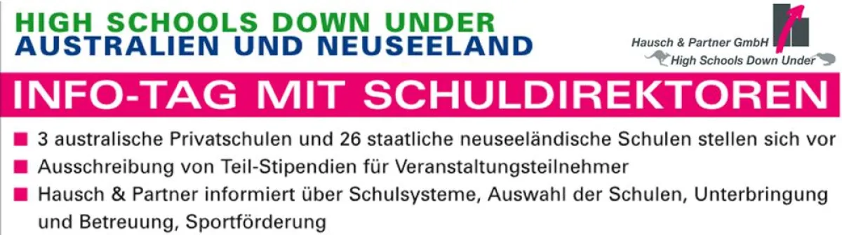 „Wir freuen uns außerordentlich über den zahlreichen Besuch und die Vielzahl ausgeschriebener Teil-Stipendien! Eine derart geballte Präsenz von Schuldirektoren aus diesen Ländern hat es bis dato in Deutschland noch nie gegeben,“ ergänzte Kristine Hausch von Hausch & Partner. Die auf Schulaufenthalte in Australien und Neuseeland spezialisierte Agentur hatte zu den beiden Veranstaltungen nach Köln und Hamburg eingeladen. Die Bundesländer Nordrhein-Westfalen, Hamburg und Schleswig-Holstein führen deutschlandweit bei der Anzahl von Schulaufenthalten ‚Down Under’ und sind für die dortigen Schulen besonders wichtig. Das Team von Hausch & Partner begleitet die Info-Tage beratend und informiert zu den Themen Schulauswahl, Unterbringung, Betreuung und Sportförderung. Mehrmals täglich wird es eine Einführung in die Schulsysteme Australiens und Neuseelands geben.