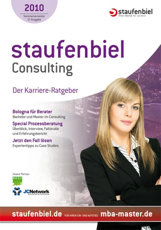 Köln, im April 2010 – Staufenbiel Consulting ist der spezifische Karriere-Ratgeber für die gesamte Beratungsbranche. Er richtet sich an examensnahe Studenten und Absolventen der Wirtschaftswissenschaften und des Wirtschaftsingenieurwesens, die ihren Berufseinstieg als Consultant planen und realisieren wollen.