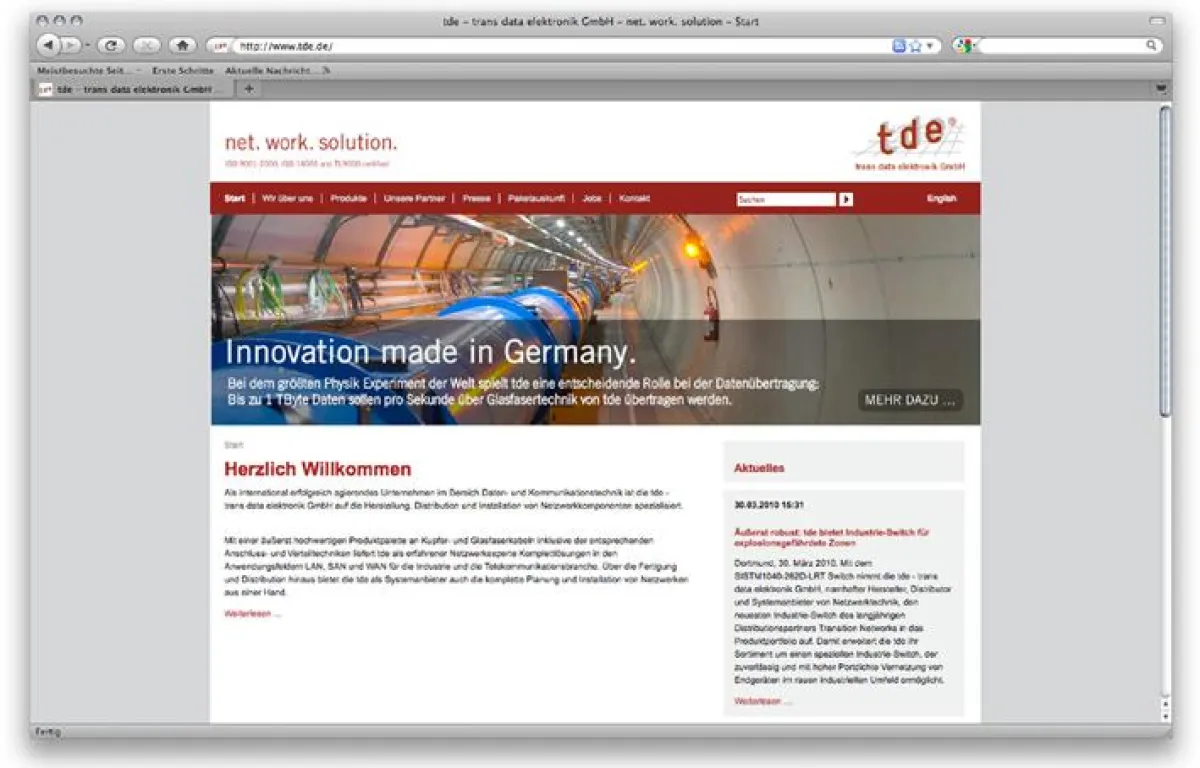 (openPR) Netzwerkspezialist tde - trans data elektronik GmbH relauncht Webauftritt Dortmund, 14. April 2010. Die tde - trans data elektronik GmbH, namhafter Hersteller, Distributor und Systemanbieter von Netzwerktechnik, präsentiert unter tde.de die neue, frisch gestaltete Firmen-Website, die sich konsequent an den Bedürfnissen der Nutzer orientiert sowie den neuen Slogan "net.work.solution." Durch die strukturelle, inhaltliche und gestalterische Überarbeitung der Seite kann sich der Besucher mit nur wenigen Mausklicks umfassend informieren und auf Wunsch sofort weitere Informationen wie tagesaktuelle Datenblätter und Preislisten herunterladen.