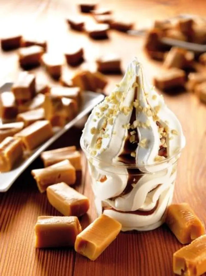 Süß und knackig präsentiert sich die Season Creation „Karamell Split“. Eine zartschmelzende Karamellsoße sowie gehackte und geröstete Mandeln verleihen dem speziellen Saison-Softeis seinen unnachahmlichen Geschmack und verfeinern das hochwertige Romeo …