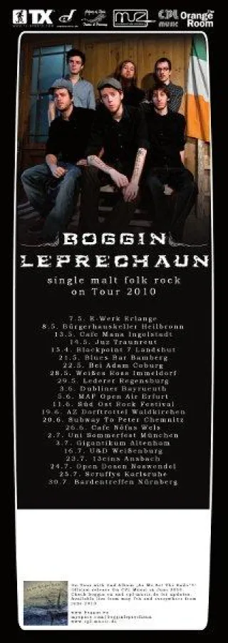 (openPR) Die Nürnberger Folk Rock Band Boggin Leprechaun geht von Mai bis August auf Deutschlandtour. Gespielt werden über 20 Termine hauptsächlich am Wochenende in ganz Deutschland mit Schwerpunkt in Bayern und Baden Württemberg und einigen zusätzlichen Shows in Österreich.