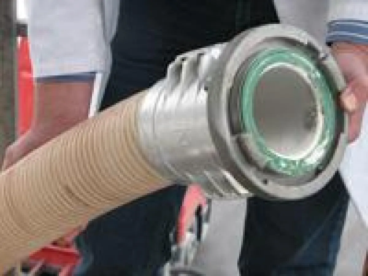Foto 1: der lebensmittelechte ableitfähige AIRDUC® PUR 356 MHF-AS verstärkt eingebunden im CONNECT Schaleneinbandsystem 230 für dickwandige Polyurethanschläuche zum Be- und Entladen von Silofahrzeugen