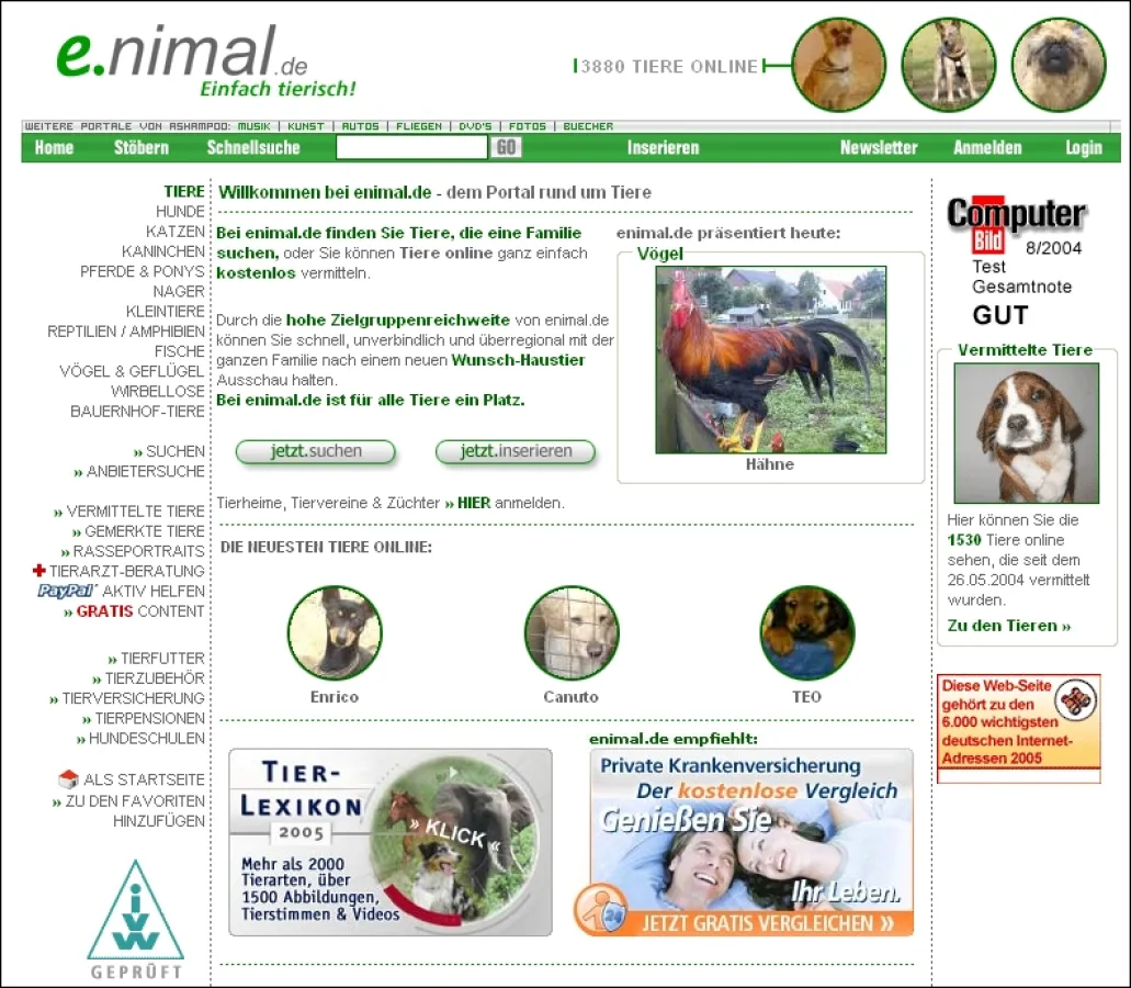 Für die hohe Popularität des Angebots (1.089.715 Page Impressions allein im Februar 2005) ist sicherlich auch das klar gegliederte Layout der Website verantwortlich. Ein Mausklick in der stets sichtbaren Navigationsleiste reicht bereits aus, um sich gezielt alle Angebote zum Thema Hund, Nager, Kleintiere, Fische oder Bauernhof-Tiere zeigen zu lassen - um nur einige der Kategorien beim Namen zu nennen. Alternativ dazu kann auch eine Schnellsuche genutzt werden, um etwa sofort zu allen Angeboten geführt zu werden, die vielleicht etwas mit "Gerbils", "Meerschweinchen" oder "Golden Retrievern" zu tun haben.