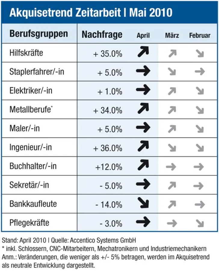 Hanau, 4. Mai 2010 | Über 160.000 Arbeitslose weniger als im März – die aktuellen Arbeitsmarktdaten der Agentur für Arbeit nähren die Hoffnung, dass die Talsohle am Arbeitsmarkt durchschritten ist. Während Arbeitsministerin Ursula von der Leyen davor warnt, dass die vorgelegten Zahlen ohne das Instrument Kurzarbeit erheblich schlechter ausgefallen wären, zeigen die Ergebnisse des aktuellen Akquisetrends Zeitarbeit, dass Unternehmen nicht nur seltener entlassen, sondern so stark nach neuen Mitarbeitern suchen wie lange nicht mehr. „Wir gehen davon aus, dass aufgrund der hohen Anzahl der geschalteten Stellenanzeigen insbesondere im Metallbereich die Kurzarbeit mittelfristig deutlich zurückgehen wird“, erklärt Christopher Schroeder, Geschäftsführer der Accentico Systems GmbH, Herausgeber des Akquisetrends Zeitarbeit.