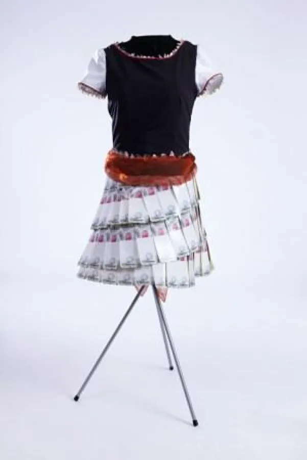 Die Studentin Maren Frost hat eine Bizerba Weltneuheit in ihrem Kleid „Eins für alle“ verarbeitet: Das VPI Etikett. VPI steht dabei für Variable-Produkt-Information. Der Nutzen für den Lebensmittelhandel liegt auf der Hand: Es wird nur noch ein Etikett für variable Daten von hunderten Produkten benötigt. Das Grundlayout wird mit den firmenspezifischen Parametern vorgedruckt – etwa mit Logo, Slogan und Corporate Design. Die Felder für die variablen Daten wie Produktname, Datum, Preis und Barcode können vom Kunden selbst aufgedruckt werden.