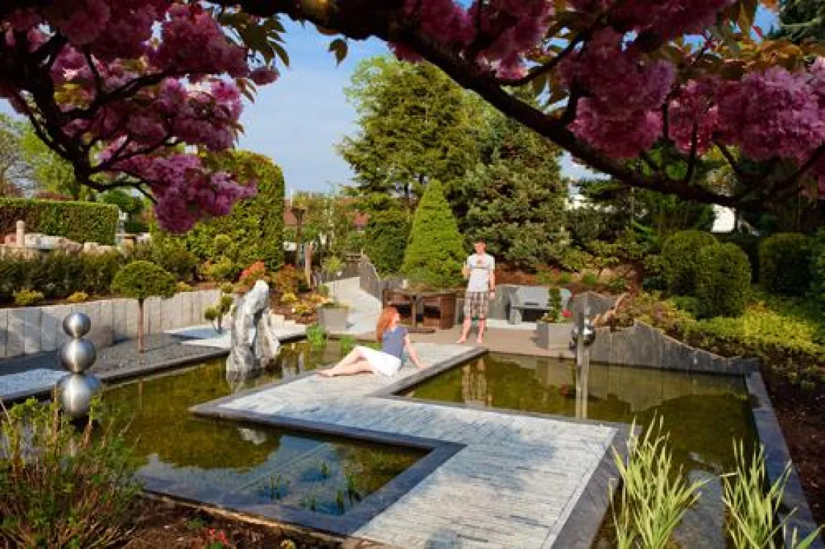 "Jedes Jahr präsentieren wir in unserer Musterausstellung auch die neuesten Trends", erläutert Johannes Holzum. Zu Beginn der Saison 2010 sind das vor allem Teichanlagen, die von geradlinigen Formen geprägt sind. Typisch bei diesem Stil sind die formal-geometrischen Konturen. Schieferplatten bis zu einer Höhe von 2,50 Metern dienen als Sichtschutz oder Böschungsabgrenzung. Bei einem Rundgang durch die Ausstellung fällt ein quadratisch angelegter Terrassenplatz ins Auge. Er ist von schmalen rechteckig gestalteten Becken umgeben, in denen stetig Wasser fließt und diese dadurch lebendig wirken lässt.