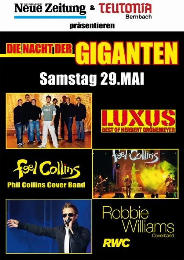 (openPR) Herbert Grönemeyer, Phil Collins und Robbie Williams gemeinsam auf einer Bühne und das im hessischen Bernbach! Kaum zu glauben? Stimmt. Nicht die Originale, sondern drei perfekte Coverbands werden bei der "Nacht der Giganten" am 29. Mai ab 20 Uhr in Bernbach zu sehen und zu hören sein. Neben Feel Collins sind das "LuXus" und "RWC", die allesamt Vollgas geben werden.