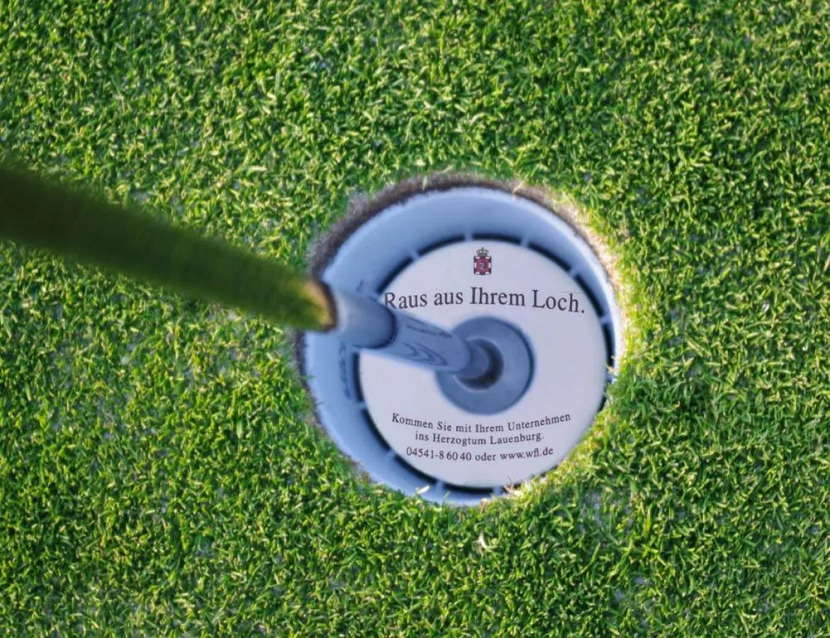 Im Zentrum der achtwöchigen Kampagne, die das Weinheimer Ambient Media Unternehmen DIN A12 momentan in den Golfclubs rund um Hamburg realisiert, stehen humorvolle, auf zweideutige Weise mit dem typischen Golfvokabular spielende Sprüche: „Raus aus Ihrem Loch. Kommen Sie mit Ihrem Unternehmen ins Herzogtum Lauenburg“ liest beispielsweise, wer am Grün zum letzten Putt ansetzt. Zudem werden kleine Leporellos sowie unterschiedlich gebrandete Golfbälle verteilt, deren Verpackung Slogans wie „Schlag auf Schlag zu mehr Erfolg“ oder „Putt, Putt, Putt…mit Ihrem Standort in Herzogtum Lauenburg“ zieren. Wer Näheres über die Wirtschaftsförderungsgesellschaft im Kreis Herzogtum Lauenburg wissen will, kann sich zudem die Informationsbroschüre des Unternehmens aus einem der Acryldispenser an den Buchungstheken der Clubs mitnehmen. Die Kampagne erfolgt in zwei Flights, weitere Maßnahmen sind im September geplant.