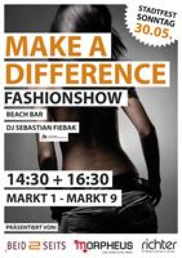 Auf dem Ahauser Stadtfest findet am Sonntag, den 30.05, eine Modenschau unter dem Thema „Make a Difference“ statt. Das Stadtfest steht unter dem Motto der Vielseitigkeit, deshalb präsentiert die Boutique Morpheus um 14.30 und um 16.30 Uhr am Markt 1 bis Markt 9 die aktuellsten Modetrends des Sommers. Das Team von Beidseits, welches selbst am 4. Juni zum Markt 1 umzieht, sorgt für modische Frisuren und Make-up der Models und der Brillenmacher Richter präsentiert die neuste Brillenkollektion. Musikalisch unterlegt wird die Modenschau von dem House DJ Sebastian Fiebak, Inhaber der Agentur Fiebak Medien. Eine Cocktail Strand Bar versorgt die Zuschauer mit bunten und fruchtigen Mixgetränken und schafft mit echtem Strandsand eine sommerliche Atmosphäre.