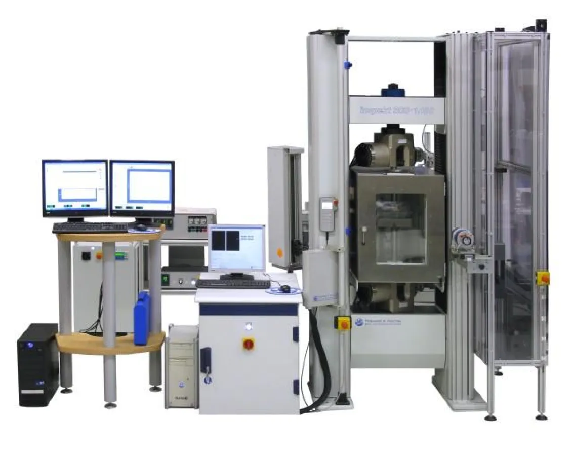 Zudem wurde die neue Anlage mit einem vollautomatischen Langwegdehnungsmessgerät sowie einem berührungslos arbeitenden Laser-Speckle-Extensometer ausgestattet. Das letztere besteht aus zwei Kameras mit LSE-Prozessor und einer FFT-Software zur Korrelationsanalyse, wodurch eine Messgenauigkeit von bis zu 3µm realisiert wird. Beide Messgeräte ermöglichen die zuverlässige Bestimmung der Längs- bzw. Querdehnung. Durch die berührungslose Laser-Speckle-Messung können einerseits lokale Dehnungsgradienten sehr leicht erkannt werden.