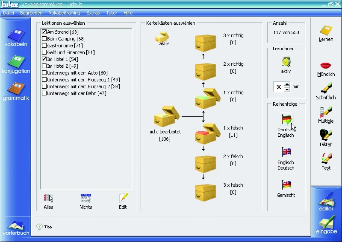 Ganz wichtig ist den Machern von Tulox das flexible Training der Lerninhalte. Michael Rössler: "Unsere Anwender können einen Multiple-Choice-Test starten, ein Diktat bestreiten, einen richtigen Test durchführen und eine schriftliche oder mündliche Abfrage einleiten. So findet jeder Anwender den Abfragemodus, der ihm am meisten liegt. Und: Das Pauken wird nicht so langweilig."