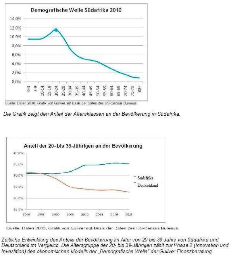 Berlin, 09. Juni 2010 – In Südafrika wird nicht nur der Ball bei der Weltmeisterschaft gut ins Rollen kommen, auch die Wirtschaft hat gute Zeiten vor sich, meint Guido Lingnau, Fondsmanager bei der Guliver Finanzberatung mit Sitz in Berlin. Seit rund 20 Jahren ist in Südafrika die Geburtenzahl rückläufig. „Der Geburtenrückgang erzeugt nach meinem ökonomischen Modell ein Kaufsignal für Aktien und Anleihen. Und dies schon seit dem Jahr 2008. Aus demografischer Sicht hat Südafrika die besten Voraussetzungen für erfolgreiche Aktien- und Anleihegewinne“, erklärt Lingnau. Der Fondsmanager beschäftigt sich seit über 10 Jahren mit den demografischen Unterschieden in den Ländern weltweit und hat auch seine beiden von ihm gemanagten Fonds (Guliver Sicherheit und Guliver Wachstum) entsprechend ausgerichtet.
