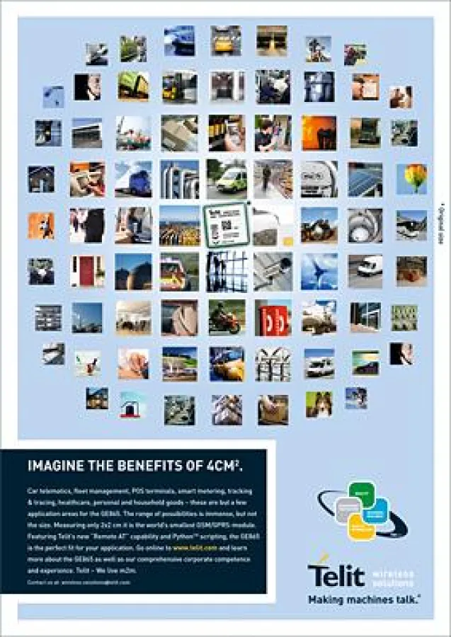 Aufgabe und Ziel der Kampagne ist es, in einem Motiv überraschend und auf den Punkt gebracht über die geringe Größe und die nahezu unendlichen Anwendungsmöglichkeiten dieses weltweit kleinsten Machine-to-Machine-Moduls zu informieren. Ob Smartphones, Automobilindustrie, Flottenmanagement, Smart Metering, Healthcare, POS-Terminals oder Haus und Freizeit – die Breite der Einsatzmöglichkeiten des Moduls ist enorm und kein relevanter Bereich darf in der Anzeige fehlen. In einer internationalen Kampagne wird beides kombiniert: Größe und Vielfalt. Dabei können unterschiedliche Kulturkreise oder Marktgegebenheiten durch eine flexible Bildauswahl berücksichtigt werden.