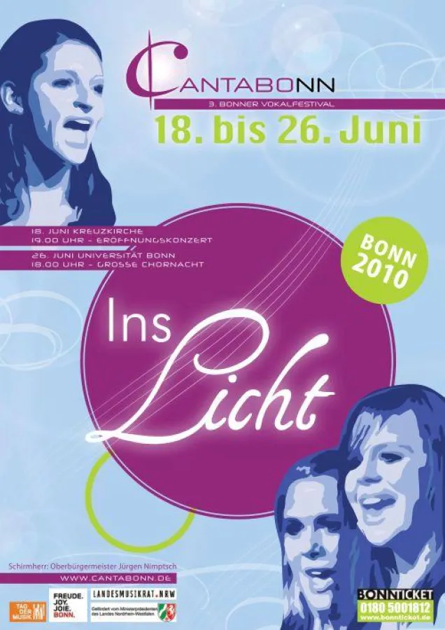 (openPR) In der Zeit von 18. bis 26. Juni präsentiert sich CANTABONN, das Bonner Vokalfestival, wieder dem Bonner Publikum. Im Vergleich zu den vielbeachteten Festivals 2003 und 2006 erfährt das Festivalkonzept gleich zwei Neuerungen. Zum einen verzichtet das diesjährige Festival auf den „Internationalen“ Beinamen und nennt sich fortan „Bonner Vokalfestival“. Die Verbundenheit zur Stadt Bonn steht nun für die Macher des Festivals mehr im Vordergrund, wenn auch ergänzt durch eine Prise europäischer Zwischentöne. Dass dies kein bloßer Schilderwechsel ist, unterstreicht der Tag der Musik unter dem Motto „Bonn Singt!“, der am 20. Juni stattfindet. Im Rahmen dieser Veranstaltung bietet das Festival interessierten Chören aus Bonn und der Region unter anderem eine offene Bühne für ein eigenes kleines Konzert. Aber auch viele Gastensembles aus Bonn, die diesmal mit ihren Konzerten und Auftritten einen festen Platz im Programm finden, bestätigen die neue Ausrichtung des Festivals. Zum anderen wurde der Hauptschwerpunkt bei der Gestaltung des Festivalprogramms auf das Neue, Ungewöhnliche, wenig oder Unbekannte gelegt - seien es Werke, Darbietungsformen oder Konzertorte. Dieser Suche nach Innovativem ist auch das diesjährige Festivalmotto verpflichtet - „Ins Licht“. Mit der ersten und größten Neuerung der Schöpfungsgeschichte – dem Werden des Lichts – setzt sich beispielsweise das spektakuläre Programm des Bonner Kammerchores „Ins Licht“ auseinander. An einem ungewöhnlichen Ort erhebt ein ungewöhnliches Werk seine Stimme gegen die Armut und wirft so ein Schlaglicht auf die Missstände dieser Welt („Poverty Requiem“, ein Projekt des Collegium Musicum der Universität Bonn in Zusammenarbeit mit Europa Cantat im „Klanggrund“ Bonner Loch). Aus der Dunkelheit des antiken Labyrinths kommen die Besucher des Kinderkonzerts zusammen mit jungen Musikern ins Licht und schauen dann in die verborgene Welt einer Spieldose (zwei Kindermusicals von und für junge Leute). Auch andere Konzerte des Festivals versprechen spannend künstlerische