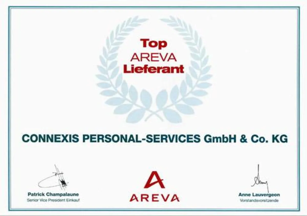 Die Connexis Personal-Services hat es somit innerhalb von zwei Jahren geschafft, sich als „TOP AREVA Lieferant“ im Bereich Personaldienstleistungen für IT und Engineering zu qualifizieren.