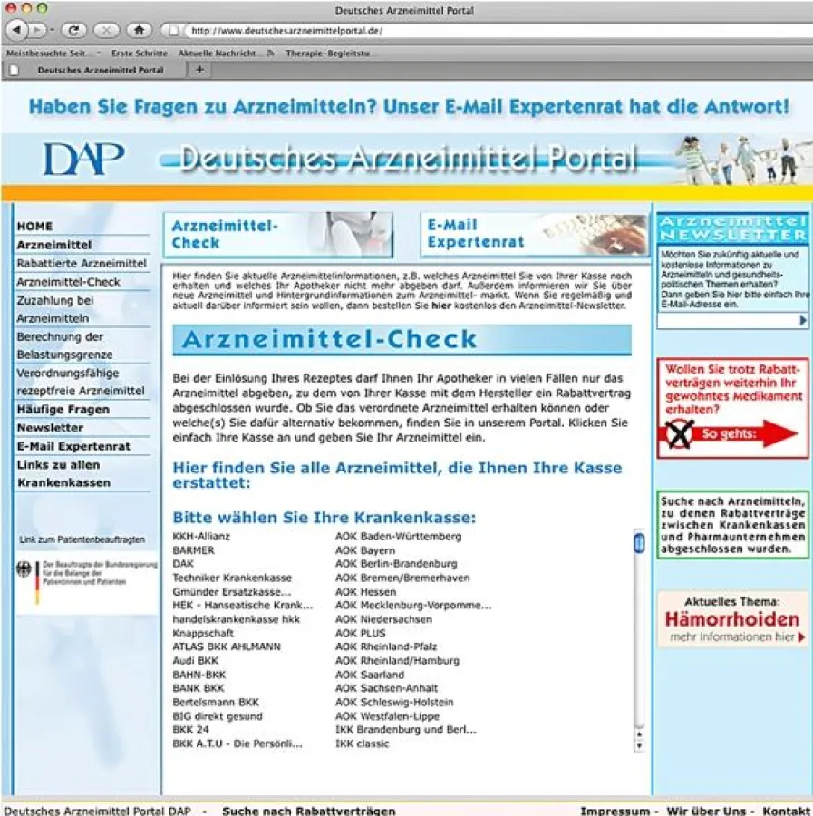 Dieses neue Online-Portal ermöglicht es den Patienten, kostenfrei über eine komfortable Suchfunktion für ihre Krankenkasse und jedes Medikament zu überprüfen, ob das Präparat in der Apotheke abgegeben werden darf bzw. welche Alternative stattdessen von der jeweiligen Krankenkasse vorgesehen ist. Zusätzlich informiert das Portal darüber, wie hoch die fällige Zuzahlung ausfällt, die je nach Abgabepreis des Medikamentes variiert. Zum neuen Service-Angebot gehören außerdem umfangreiche und verständlich aufbereitete Informationen zu vielen Gebieten rund um Rezeptpflicht, Belastungsgrenzen und die Erstattung medizinischer Leistungen.