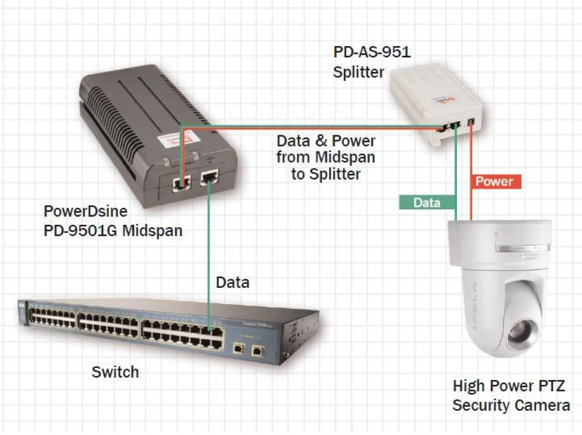 Viele moderne Endgeräte werden ohne die Möglichkeit der Stromversorgung über ihren LAN-Eingang konzipiert und implementiert. Bei solchen Geräten erfolgt die Stromversorgung nur über die DC-Buchse, während der RJ45-Eingang nur für Daten geeignet ist. Darüber hinaus wären diese Geräte nur für Spannungen geeignet, die unter der normalen PoE-Mindestspannung liegen (44 V bei IEEE802.3af bzw. 50 V bei 802.3at). Bei Verwendung des Hochleistungs-Splitters PD-AS-951 sind diese Endgeräte sofort HiPoE-kompatibel, ohne dass Änderungen an ihnen