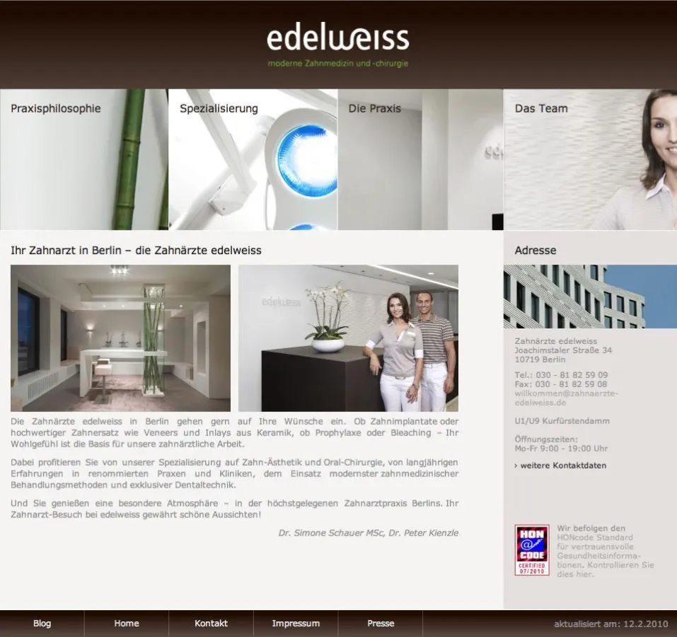 Berlin (zahnärzte edelweiss/20.07.2010) „Die Informationen auf unserer Praxiswebsite entsprechen höchsten internationalen Qualitätsstandards“, sagt Dr. Peter Kienzle, Mitinhaber der Zahnarzt-Praxis edelweiss in Berlin Charlottenburg. Die Zahnarztpraxis, die Kienzle gemeinsam mit Dr. Simone Schauer am Kudamm in Berlin West führt, erhielt gerade das HONcode-Zertifikat für die Praxishomepage. Das geht nur an solche Webseiten, die Qualität und Vertrauenswürdigkeit ihrer Gesundheitsinformationen unter Beweis stellen. Von der Stiftung Health On the Net ins Leben gerufen, ist HONcode der älteste ethische Verhaltenskodex für die Veröffentlichung medizinischer Informationen im Web. Auf Webseiten, die das HONcode-Siegel tragen, stammen solche Informationen ausschließlich von entsprechend ausgebildeten und qualifizierten Fachleuten. „Mit dem HONcode-Zertifikat signalisieren wir unseren Patienten den hohen Stellenwert transparenter und kompetenter Kommunikation“, so Kienzle.