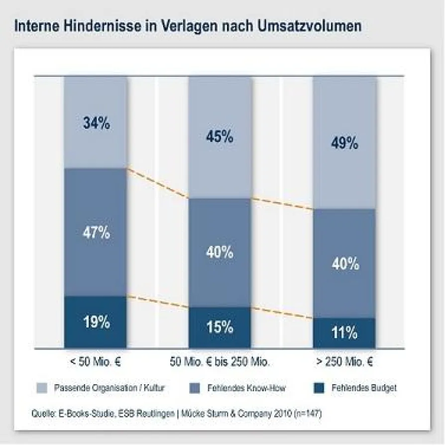 Vor allem die großen Verlage zeigen sich wenig anpassungsfähig. Für 49 Prozent der Verlage mit einem Umsatzvolumen größer als 250 Millionen Euro ist die Modernisierung ihrer Organisationsstrukturen die relevanteste Aufgabe. Kleineren Verlagen fehlt dagegen oftmals das entsprechende Know-how. Generell besteht aber eine hohe Investitionsbereitschaft für E-Books. Sie stehen auf der Agenda der meisten Verlage ganz oben und sind entsprechend mit Projektbudget ausgestattet.