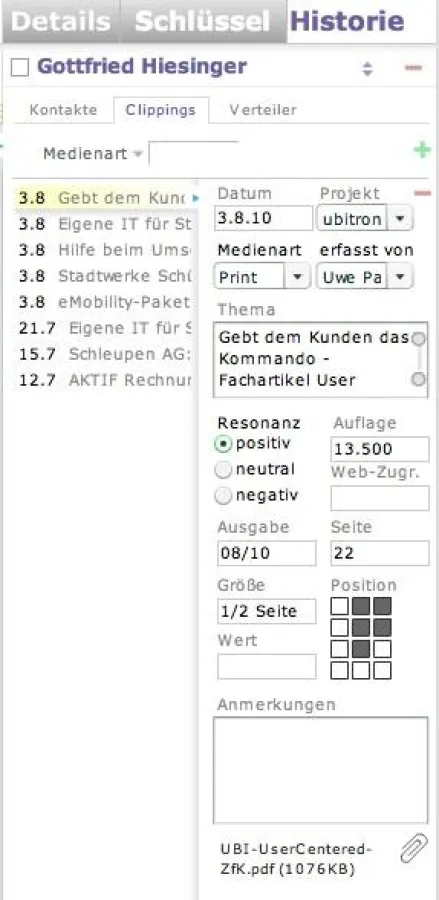 Das Clipping Management ist in die Kontakthistorie von PressFile integriert und wird über einen eigenen Reiter aufgerufen und steht so ebenfalls über das zentrale PressFile-Fenster zur Verfügung. Der Anwender behält jederzeit den Überblick, zu welcher Zielgruppe und zu welchen Medien die einzelne Veröffentlichung gehört. Auch die Projektstruktur der Kontakthistorie wird übernommen, so dass die Veröffentlichungen problemlos einzelnen Kunden (bei PR-Agenturen), Produkten, Produktgruppen oder anderen Projekten (in Pressestellen) zugeordnet werden können.