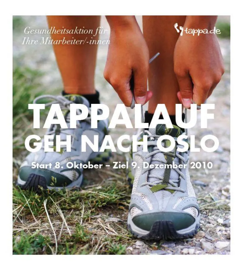 Das Ziel ist, täglich 10.000 Schritte zu gehen und in 63 Tagen Oslo zu erreichen – virtuell natürlich. Übrigens: Die Deutschen gehen im Durchschnitt 5.000 Schritte am Tag. Fast unscheinbar zählt der tappa-Schrittzähler jeden Schritt. Morgens anlegen, den gesamten Tag über fleißig Schritte sammeln und die Ergebnisse abends auf der tappa-Internetseite registrieren. Mit vielen sportlichen Aktivitäten lassen sich sogar Extra-Schritte ergattern. Mit den so zurück gelegten Kilometern bewegen sich die Teilnehmer auf einer Karte virtuell nach Oslo fort. Alle sind über das Internet miteinander vernetzt, vergleichen ihren Fortschritt anhand von Top-Listen und tauschen ihre Erfolge im Forum aus. Im Ziel angekommen, wartet bereits ein schickes Diplom und die Chance einen Reisegutschein zu gewinnen.