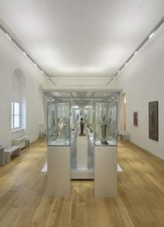 Die historischen Stuckdecken wurden komplett freigelegt und restauriert, vorgesetzte Gipskartonwände herausgenommen und Zwischentüren in die Seitenflügel versetzt. Anhand vorhandener Reste konnten die ehemals in die Wände integrierten Pilaster mit ihren Sockeln und Kapitellen komplett rekonstruiert werden. So schmücken sie jetzt nicht nur den Eingangsbereich in ihrer ursprünglichen Schönheit sondern übernehmen wieder eine tragende Funktion für das Kreuzgewölbe. Zurückhaltend integrierte Sonderleuchten sorgen mit einer indirekten Deckenaufhellung für eine angenehme Atmosphäre. In Ost-West-Richtung ist der Blick frei geworden bis zum gegenüberliegenden Westportal, das von Mauern befreit und ebenso wie der Haupteingang mit einer Glastür versehen wurde. Morgen- und Abendsonne erhellen jetzt die zentrale Mittelachse des Gebäudes. Der Blick durch die Glastüren von außen in die Ausstellungsräume weckt Neugier und verbindet die unterschiedlichen Bereiche optisch.
