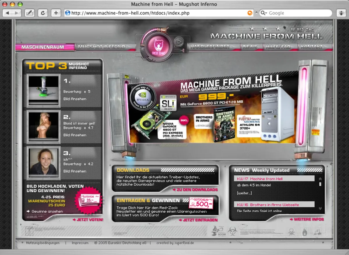 (openPR) Hamburg, 03.05.2005. Die Hamburger Interagentur superReal hat für den Kunden Euronics/Red Zac erneut eine großangelegte Kampagne unter dem bekannten Label"Machine from Hell" gestartet. Im Mai laufen für mehrere Wochenaufmerksamkeitsstarke Onlineformate auf den beliebtesten Gamer- undtechnikaffinen Portalen (unter anderem pcgames.de, gamestar.de, justgamers.de, hartware.de, planet3dnow.de, hardtecs4u.de). Ergänzend wurden Printbeilagen gebucht und E-Mail-Newsletter belegt.